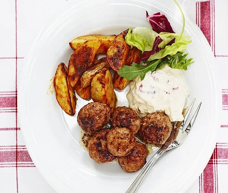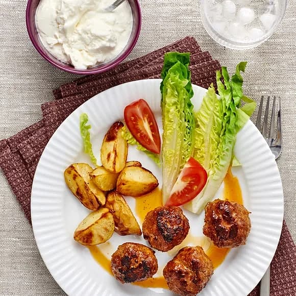 Köttbullar med äppelyoghurt och klyftpotatis