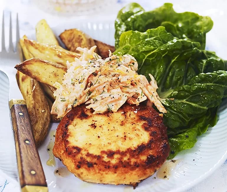 Halloumibiffar med ugnsrostad klyftpotatis, mangosås och grönsallad