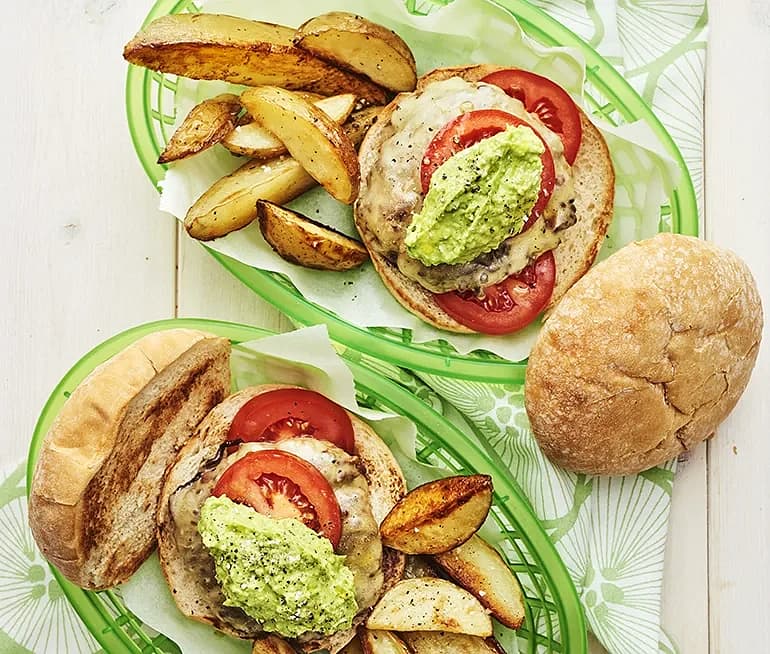 Hamburgare med avokadoröra och klyftpotatis