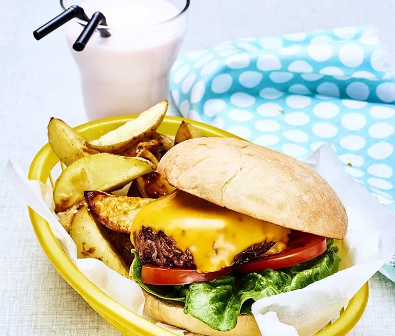 Cheeseburgare med klyftpotatis