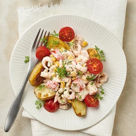 Räkröra med rostad majs och klyftpotatis