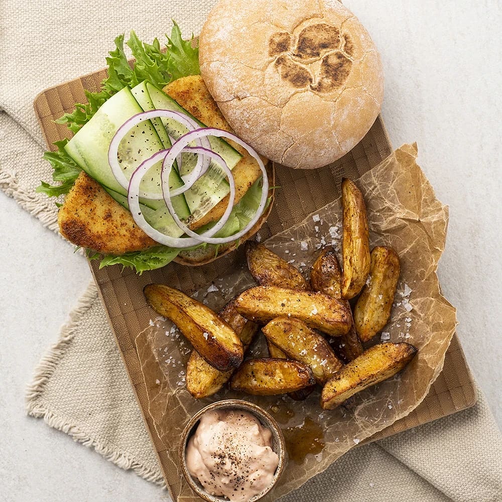 Fisk-ish burgare med klyftpotatis