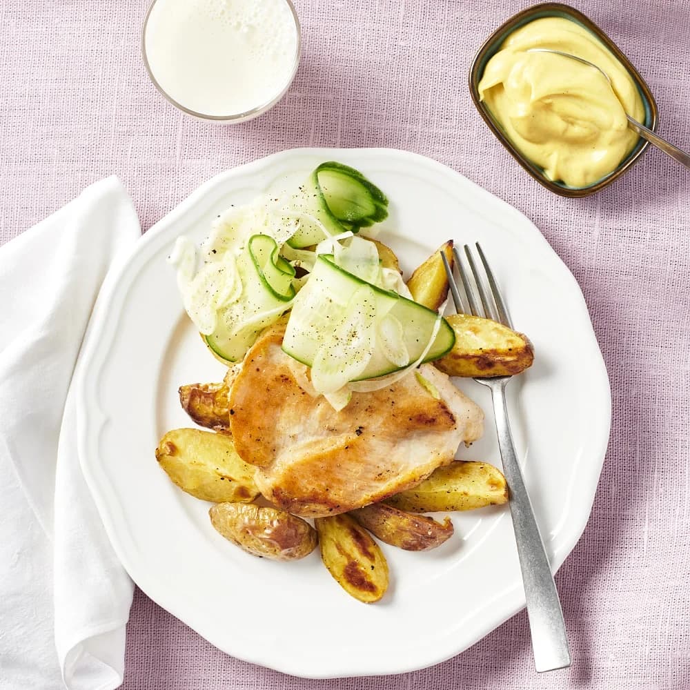Fläskkarré med klyftpotatis och gurkröra