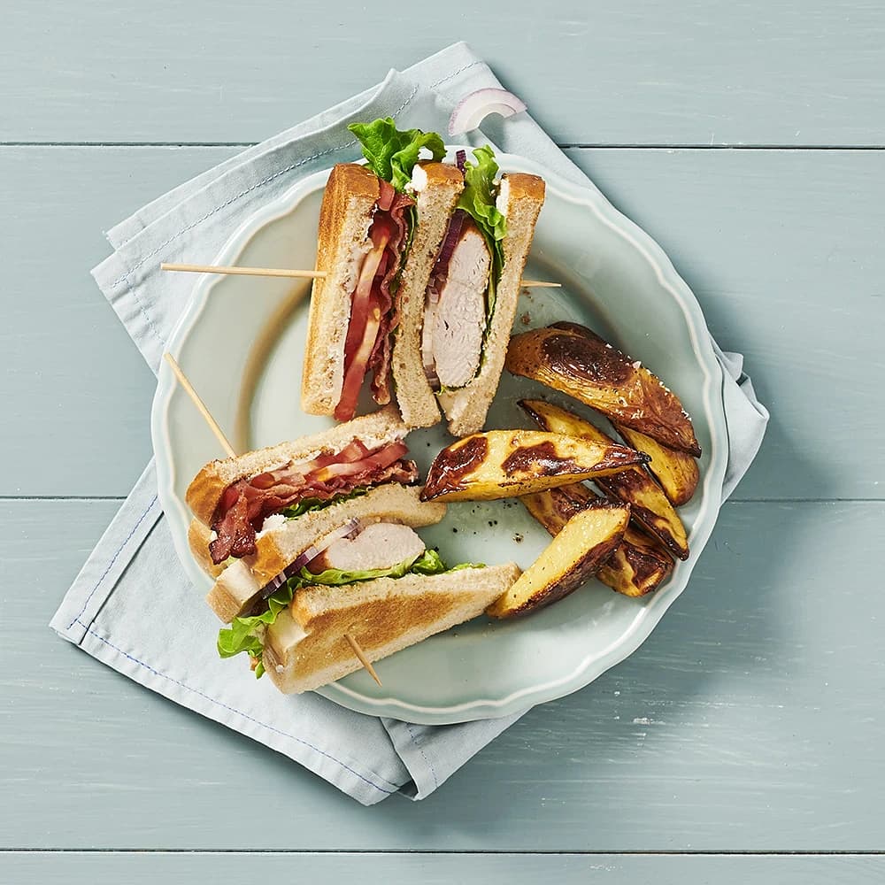 Club sandwich med pepparrot och klyftpotatis