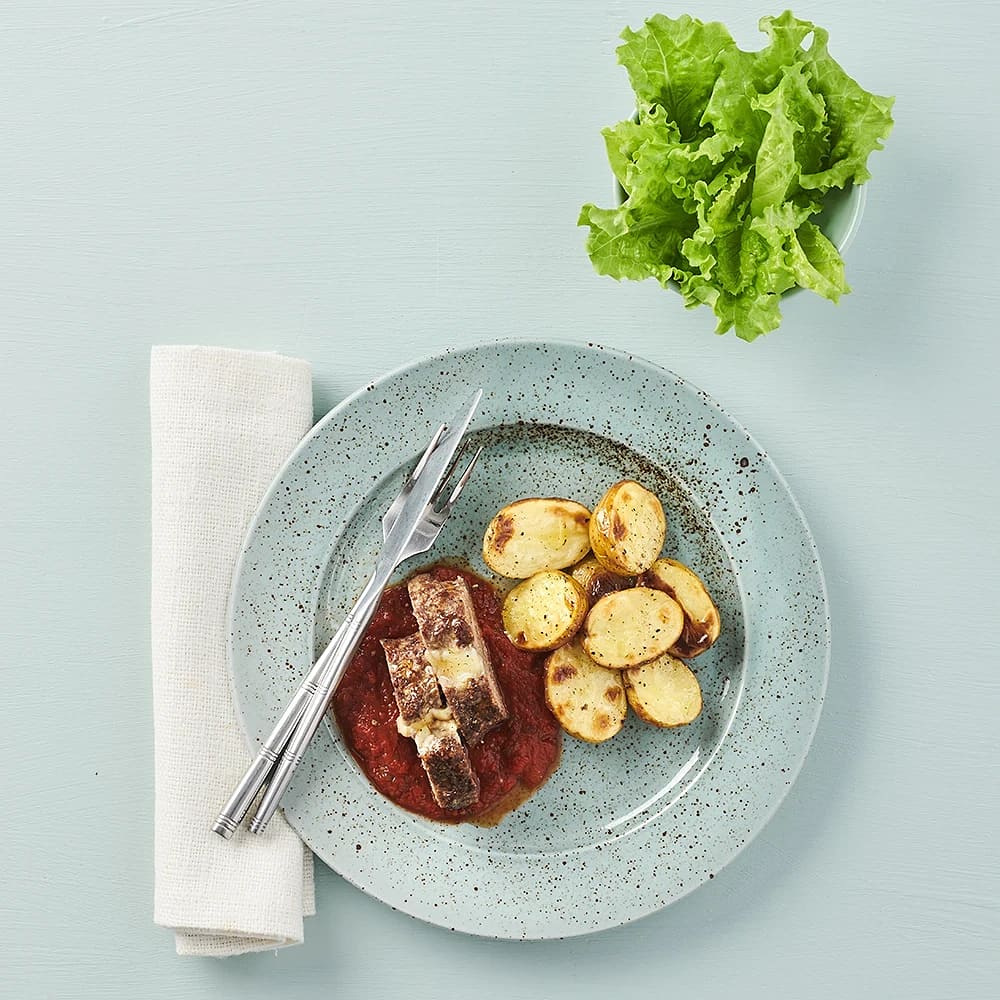 Ostfylld baconlövbiff med klyftpotatis