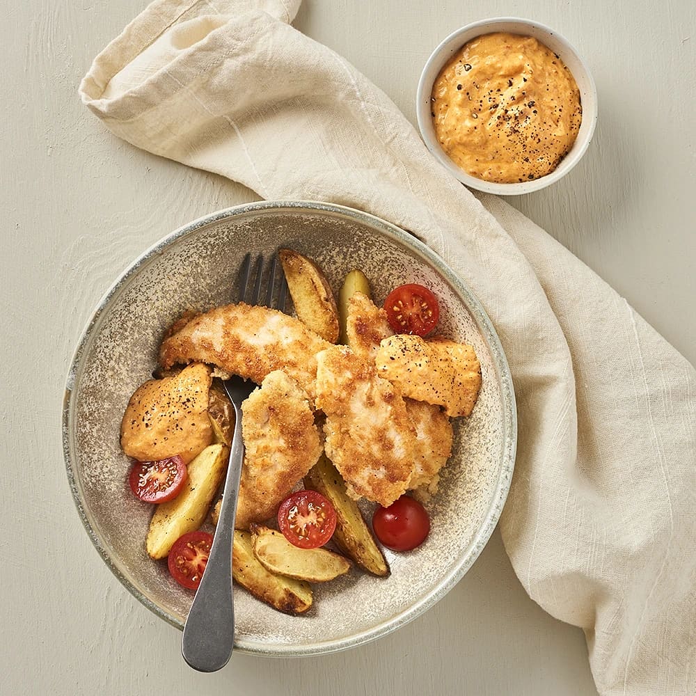 Panerad kyckling med currydip och klyftpotatis
