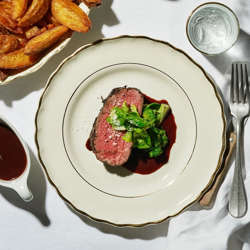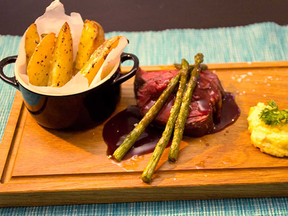 Lyxig oxfilé med rödvinssky och friterad klyftpotatis