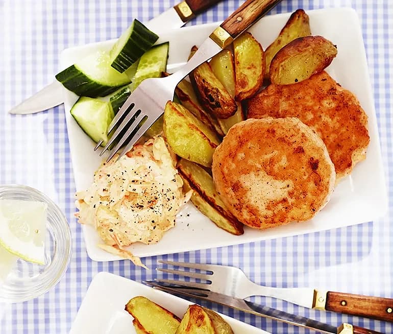 Laxburgare med klyftpotatis och morots- och currysallad