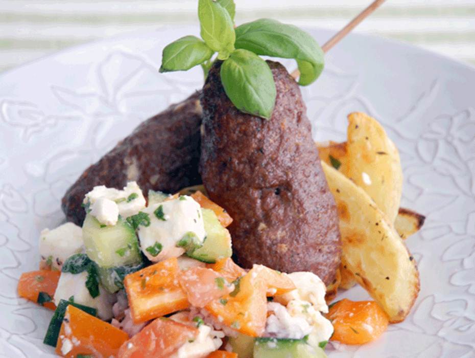 Färsspett med klyftpotatis och fetaostsallad
