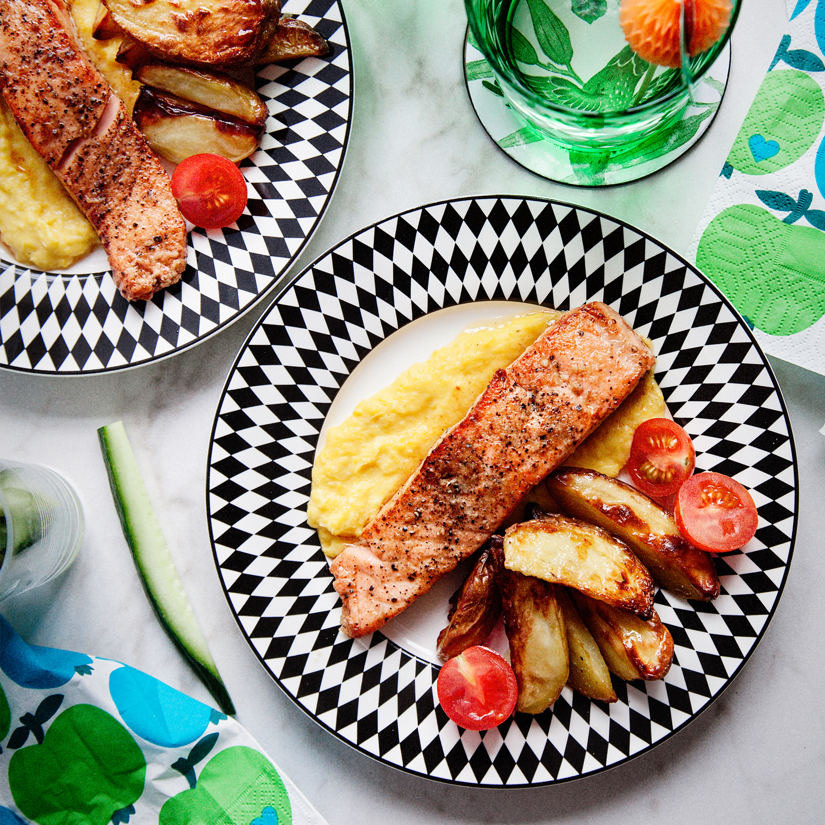 Stekt lax med klyftpotatis och majspuré