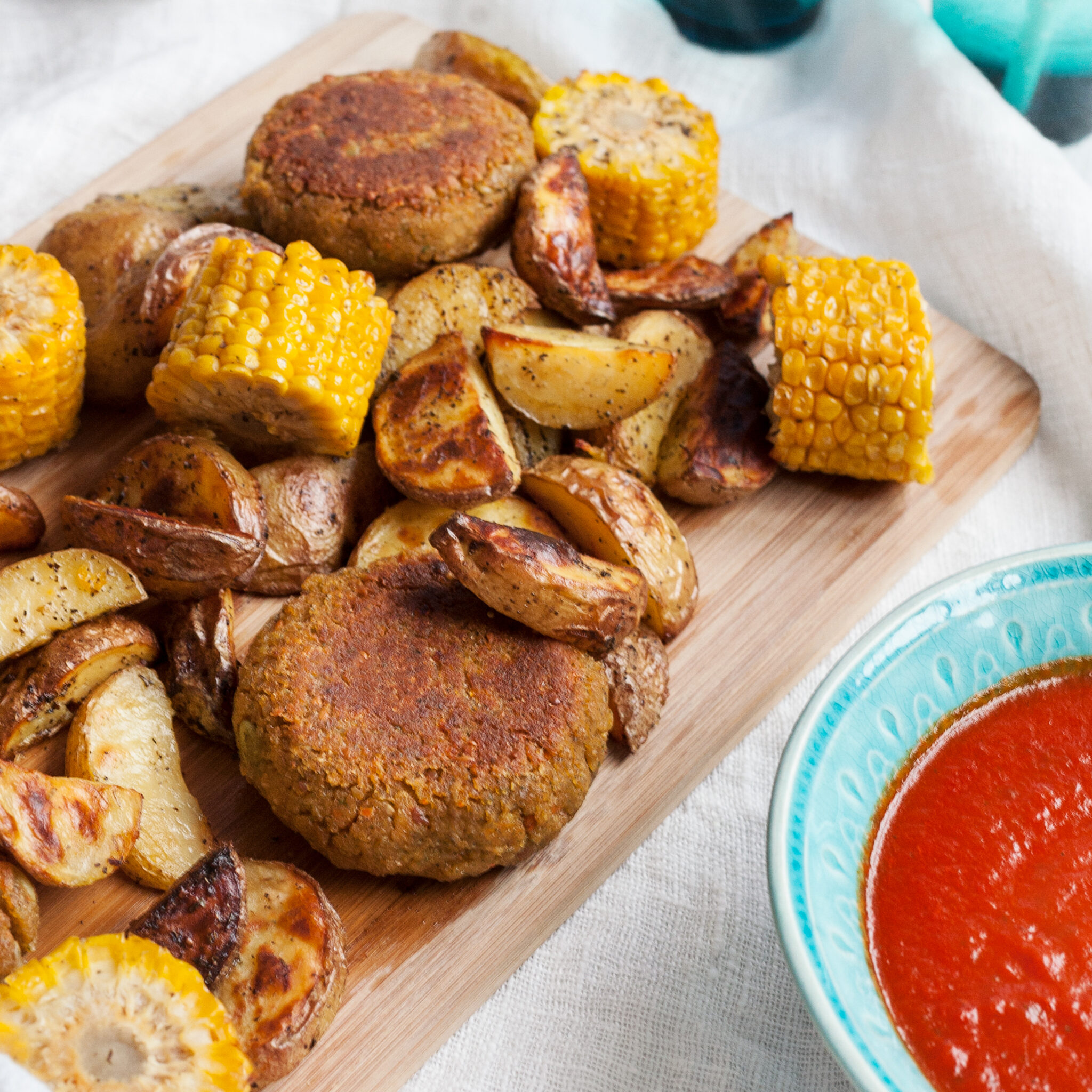 Quinoaburgare med grillad majs och klyftpotatis