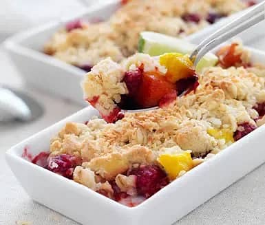 Bakade plommon med vit choklad, kokos, hasselnötter och mynta