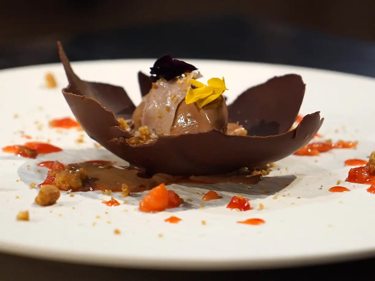 Chokladglass med karamelliserade bananer och kokos- och bananbräck