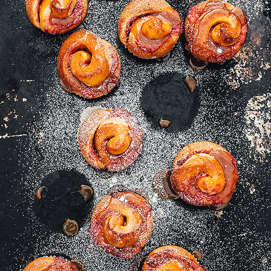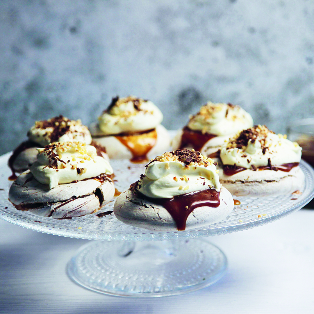 Små pavlovor med nutellaswirl, salt kolasås, grädde och hasselnötskross