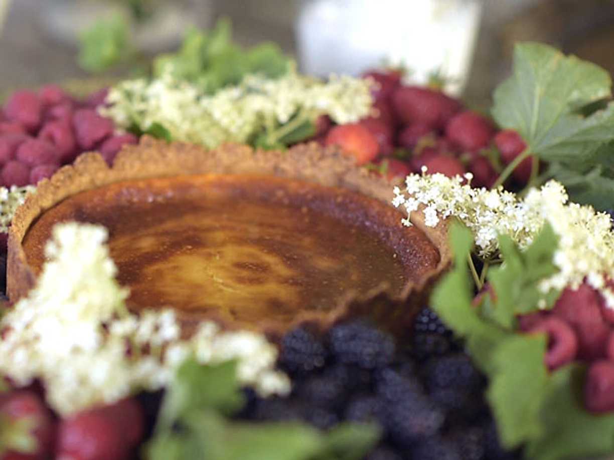 Färskosttårta med flädergelé, färska bär och grädde