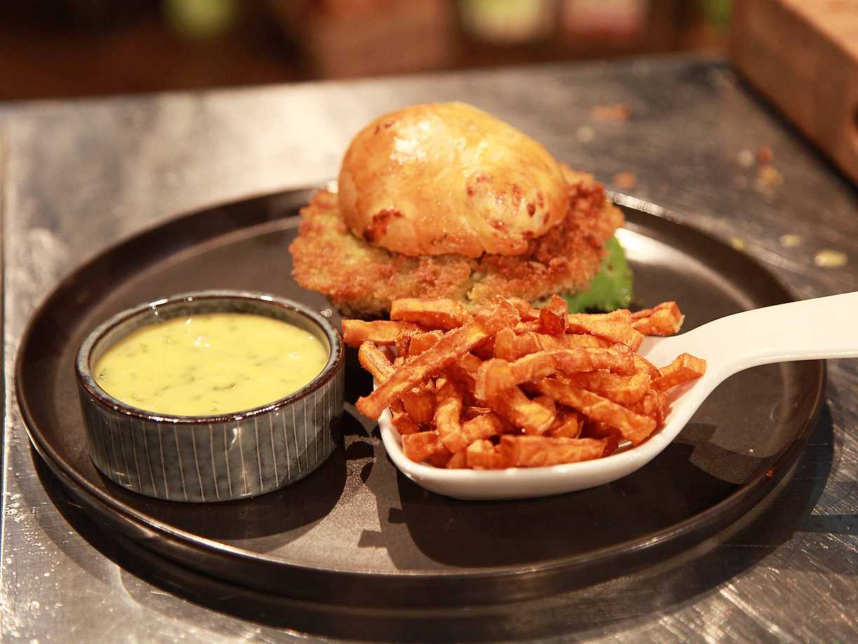 Kikärtsburgare med chili-och koriandermajonnäs och sötpotatispommes
