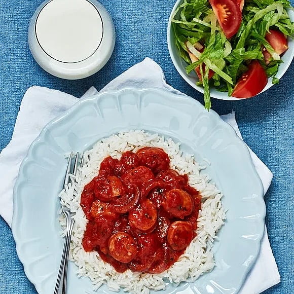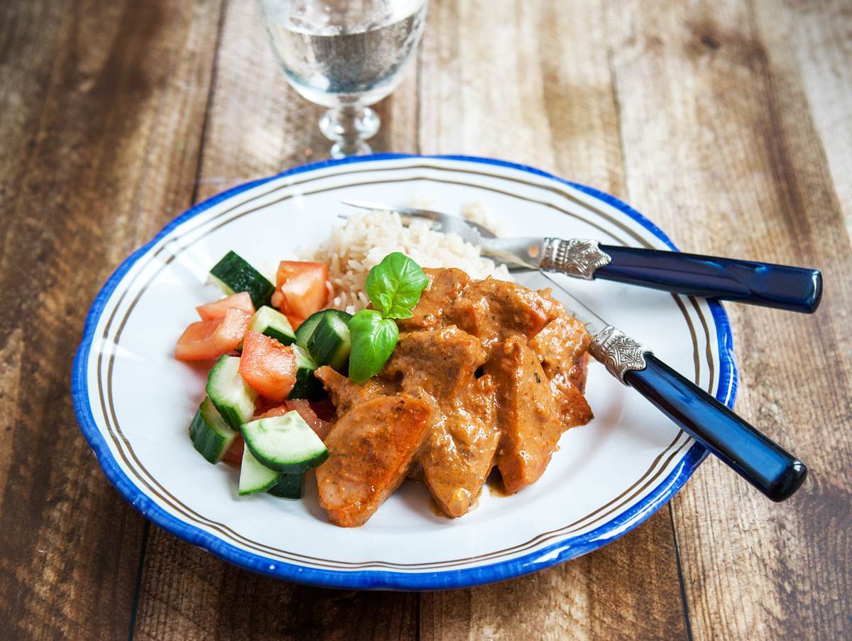 Korvstroganoff med ris och gurka