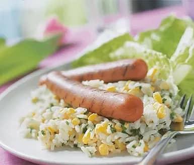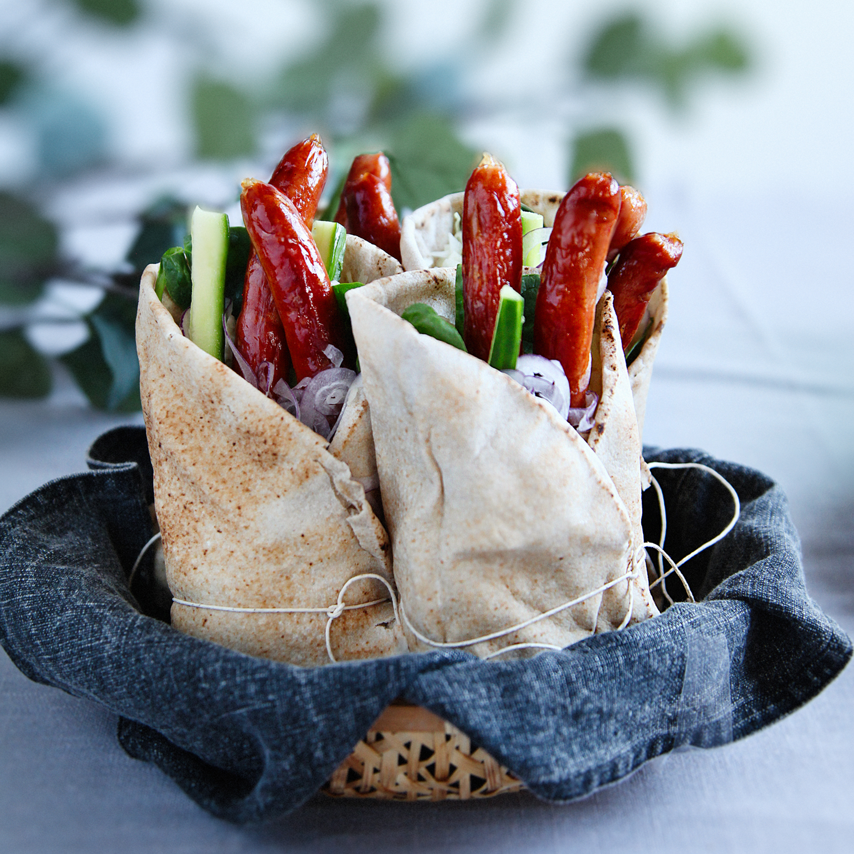 Grillad korv i tortillabröd med krämig färskpotatissallad