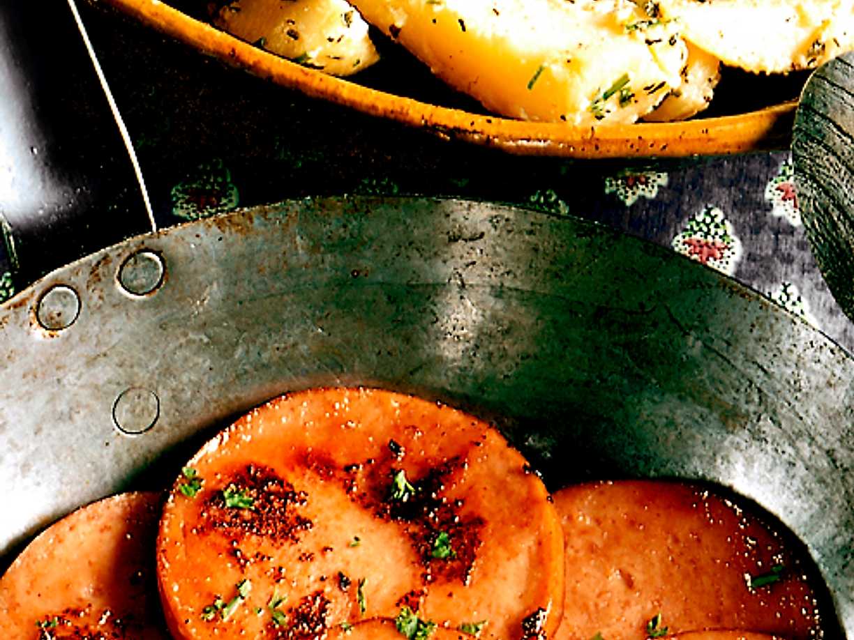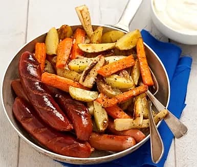 Stekt korv med gräddkokt fänkål och potatisstomp