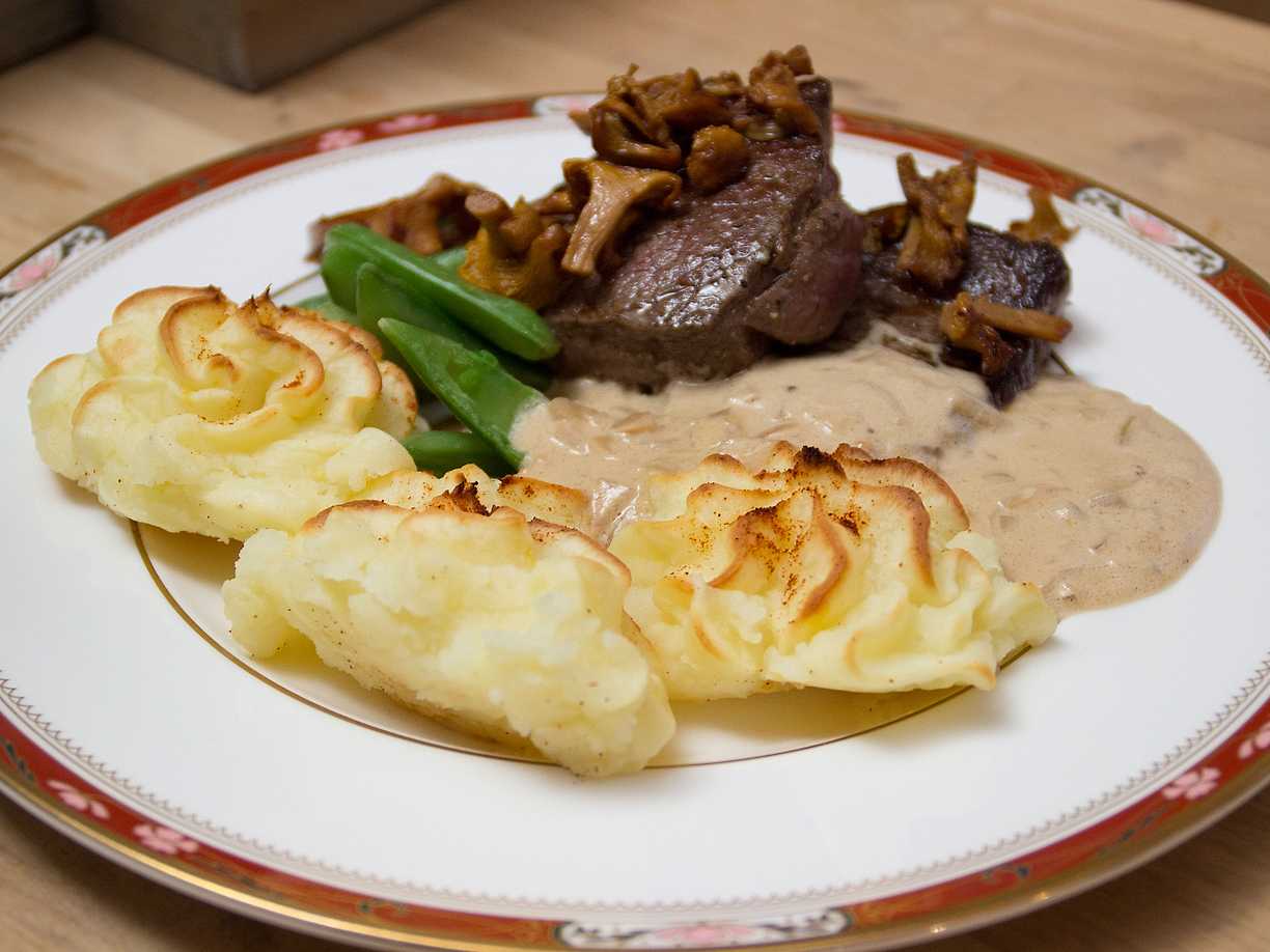 Marinerat kött med hjortronvinsås och västerbottensostsmakande mandelpotatiskuber