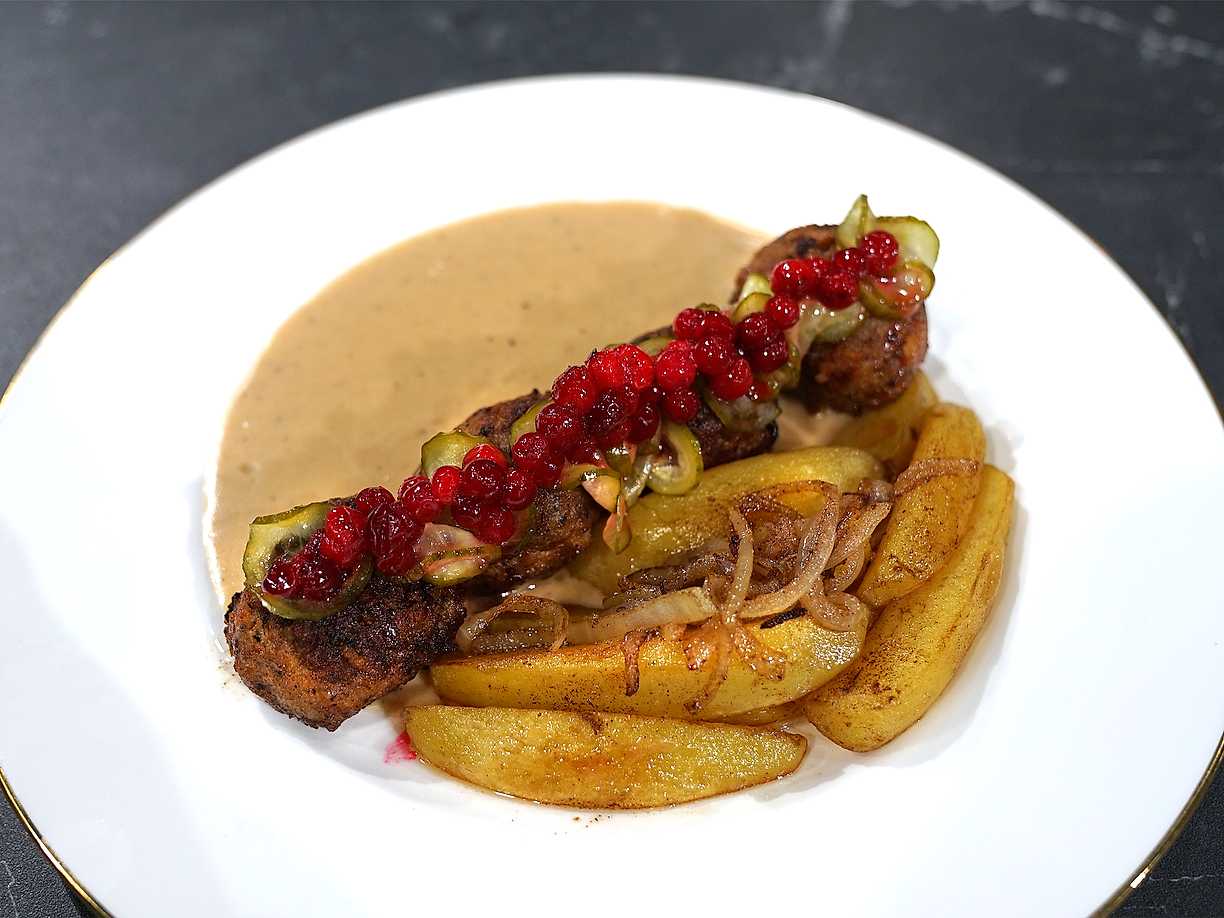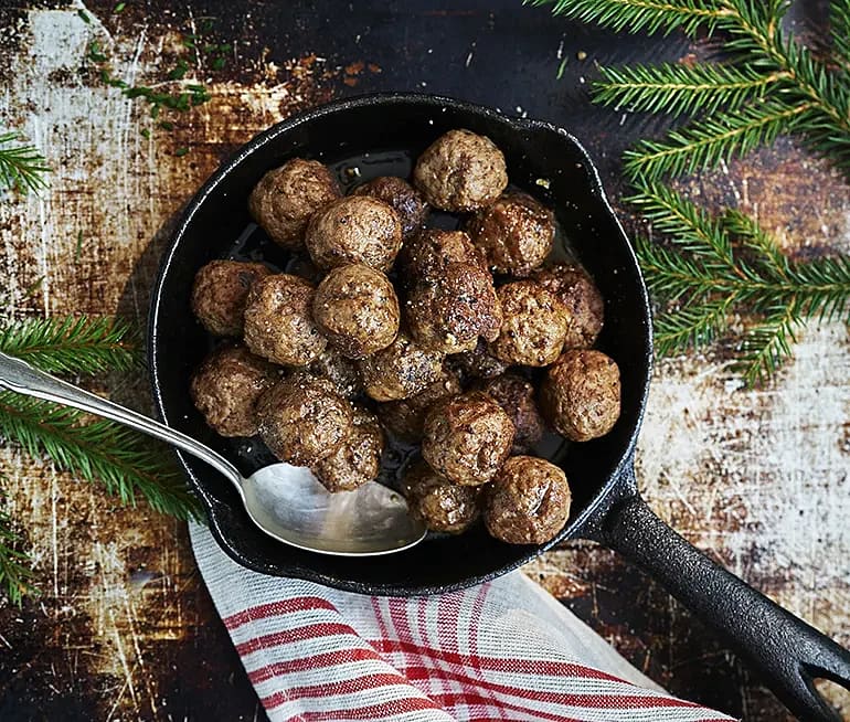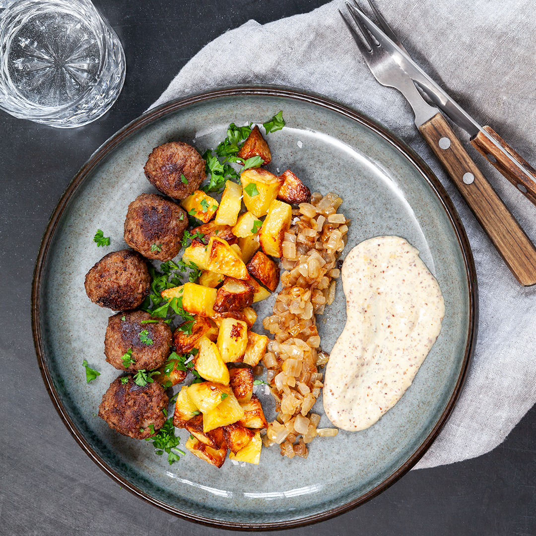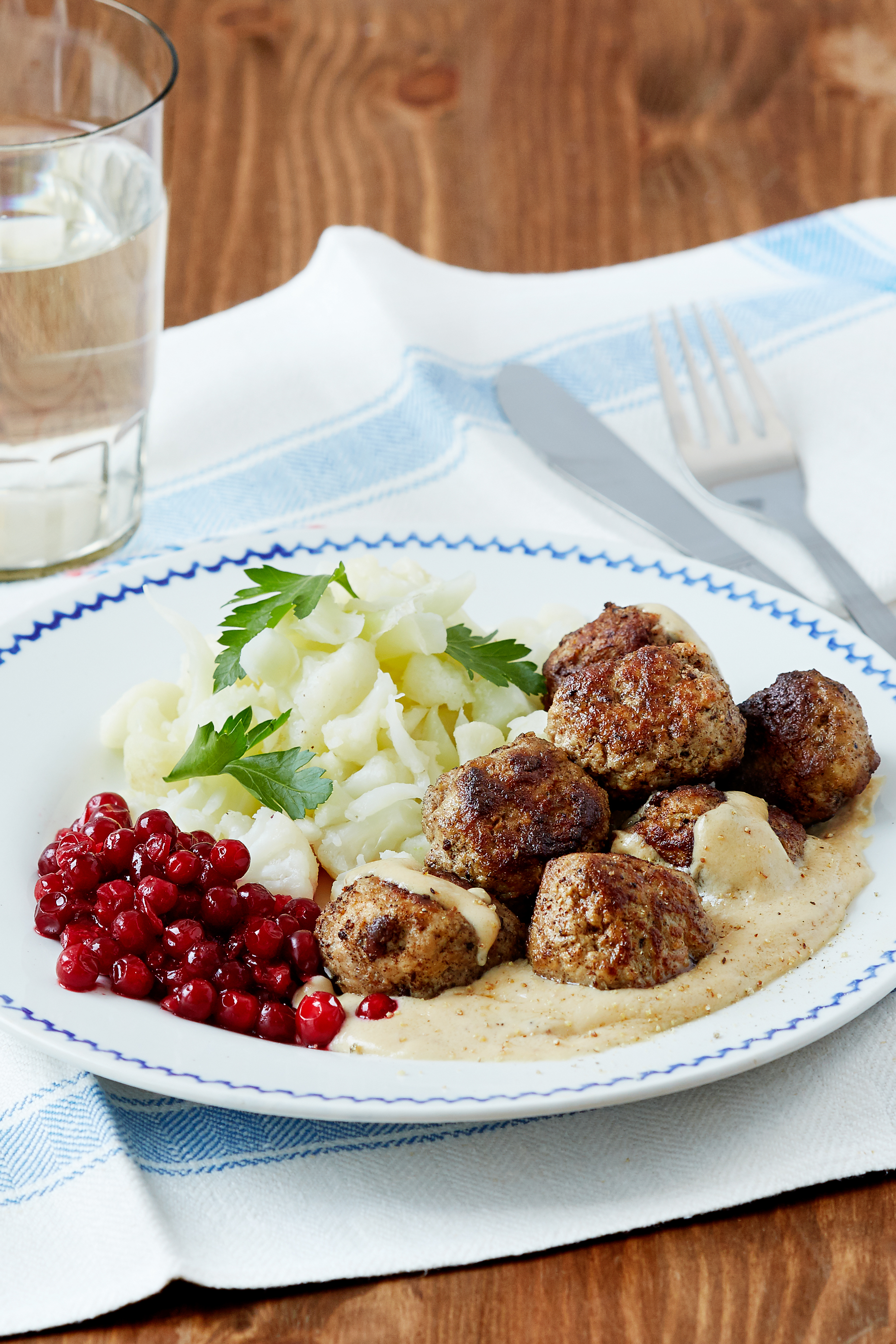 Klassiska köttbullar med potatismos, lingon och inlagd gurka