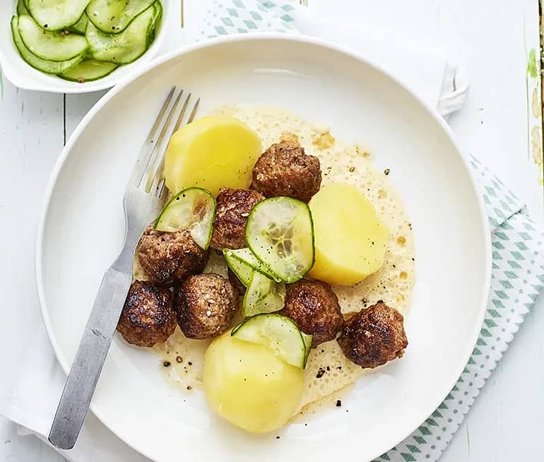 Köttbullar med potatisstomp, gräddsås och pressgurka