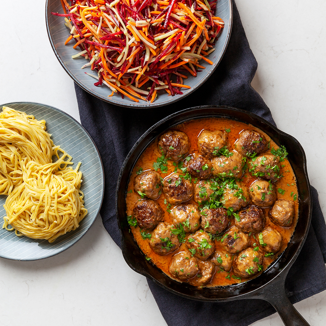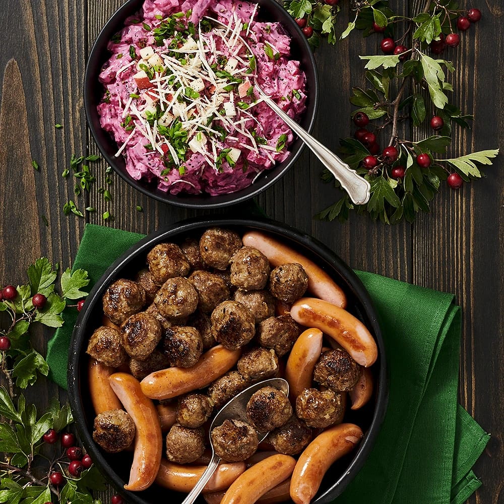 Köttbullar och kycklingprinskorv med rödbetssallad