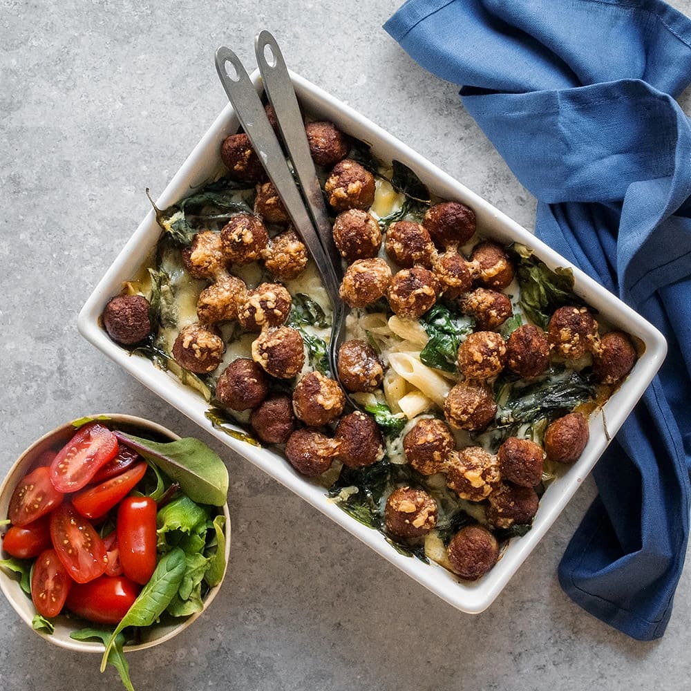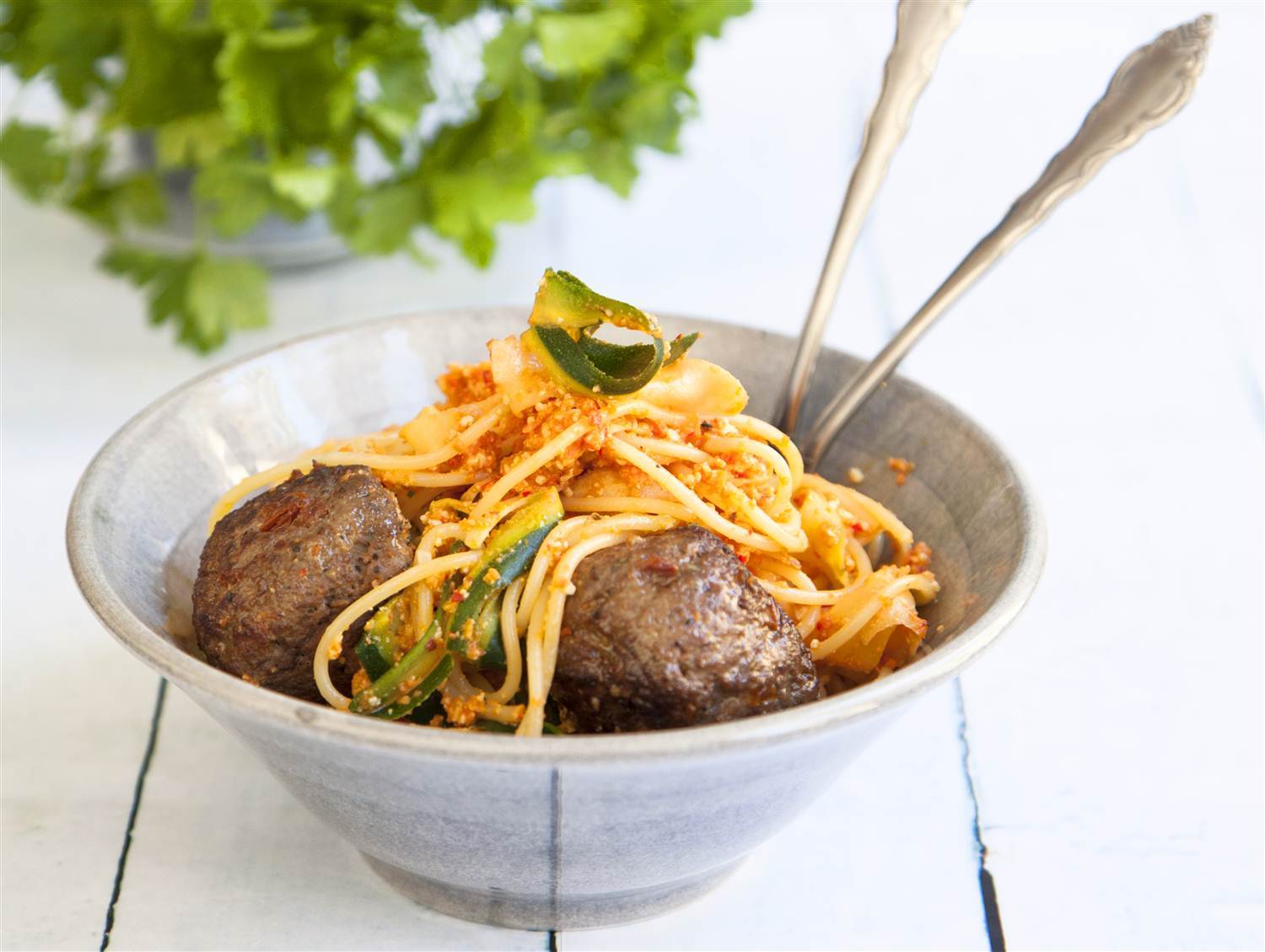 Köttbullar i tomatsås med rostade grönsaker och pasta