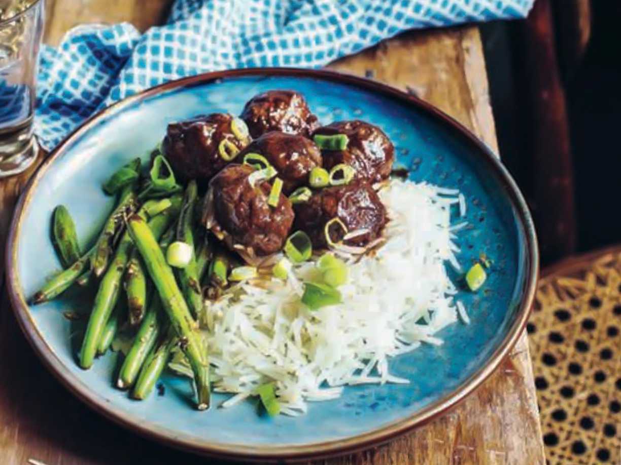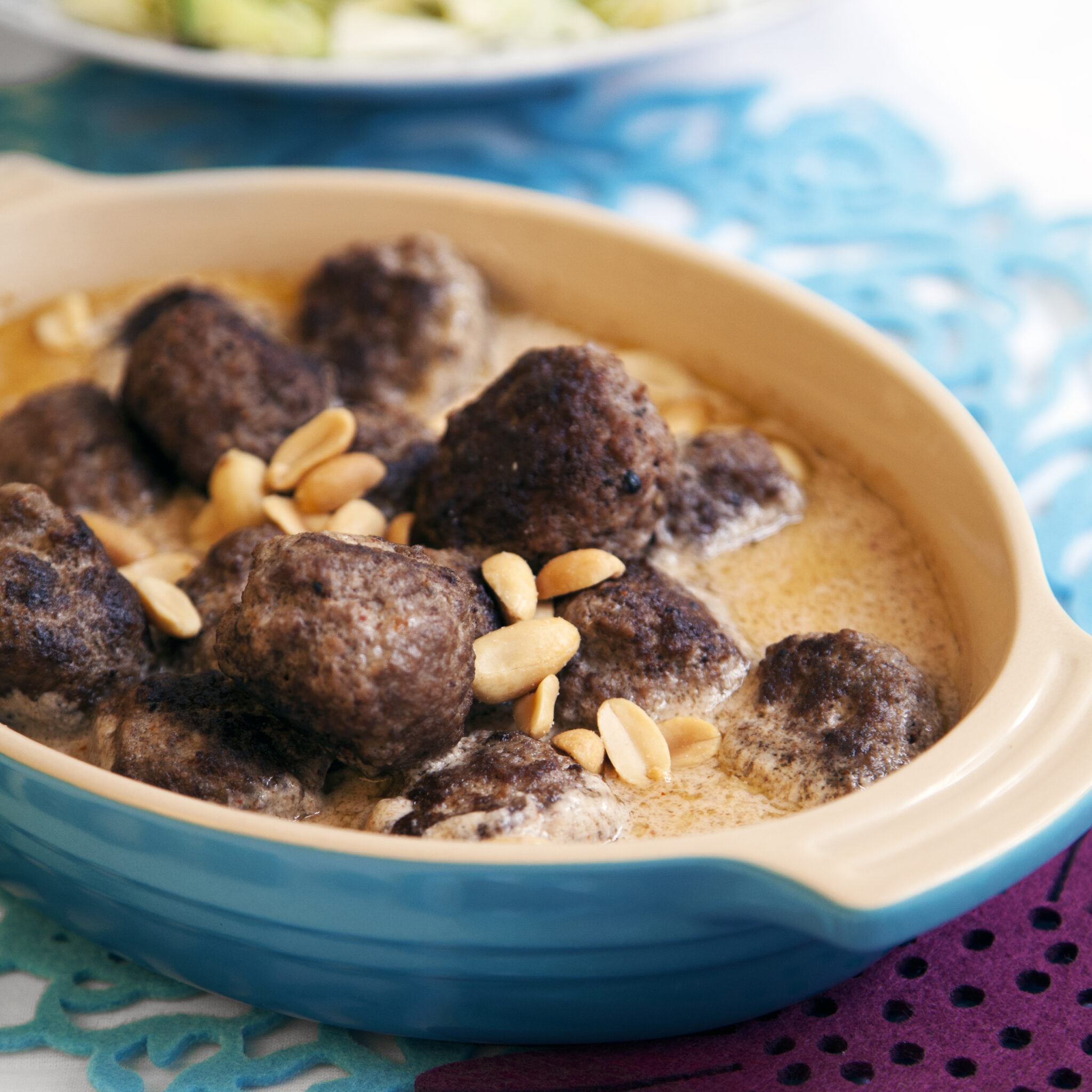 Asiatiska köttbullar i jordnötssås med äggnudlar