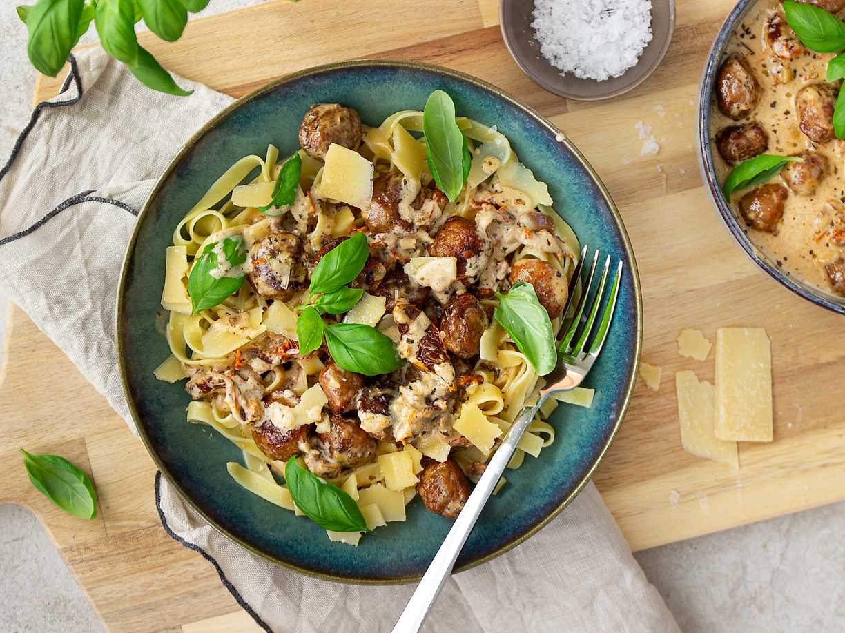 Getost- och basilikafyllda köttbullar i tomatsås med pasta