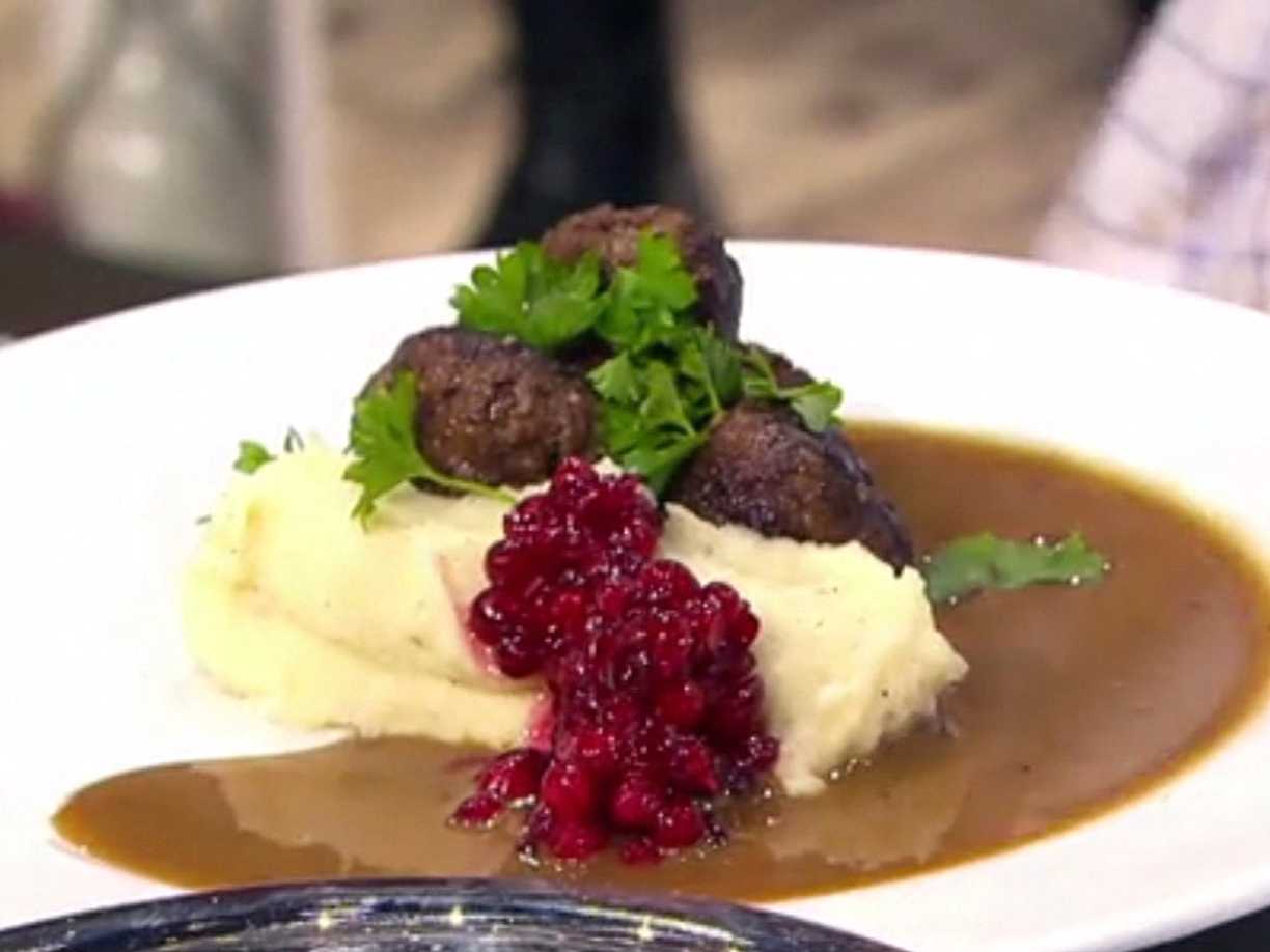 Yvonnes köttbullar med potatispuré, lingonsylt och pressgurka
