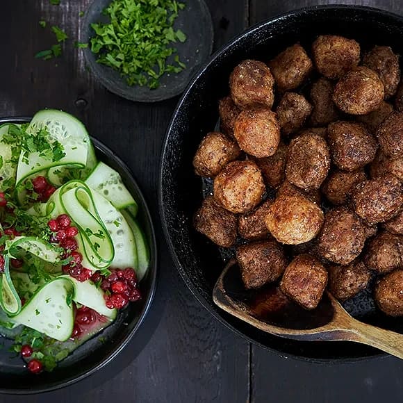 Kryddstekta köttbullar med gurk- och lingonsallad