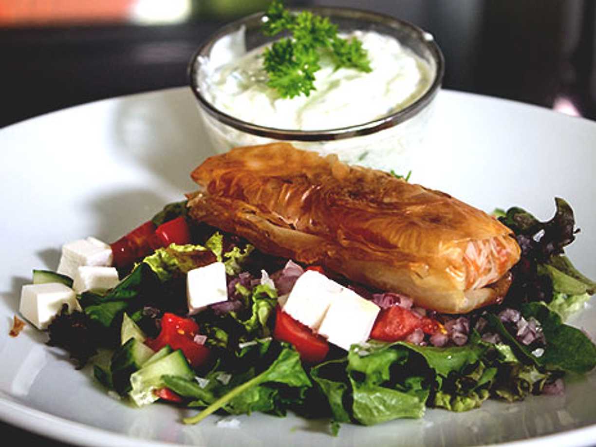 Köttfärs- och grönsaksfylld filodeg på salladsbädd med tsatsiki
