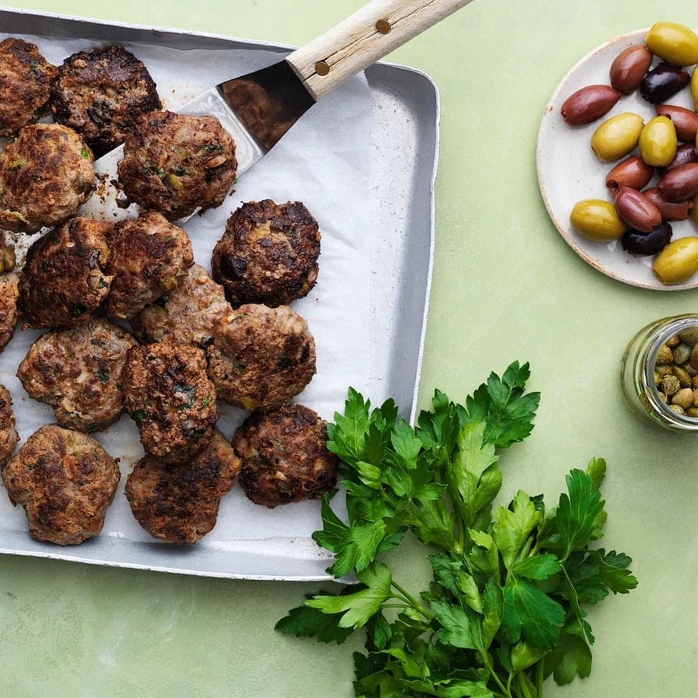 Små köttfärsbiffar med oliver och kapris