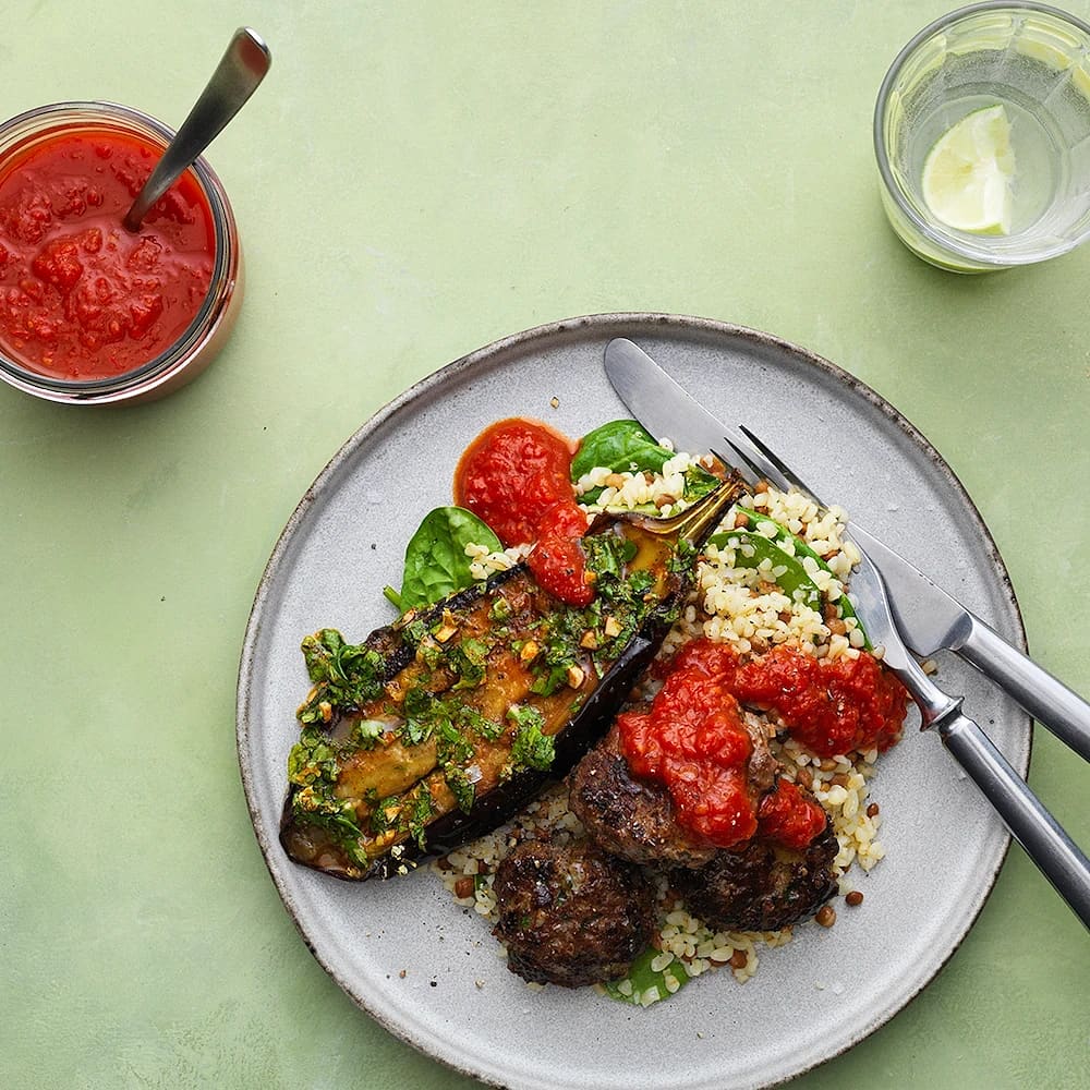 Aubergine med köttfärsbiffar och bulgur