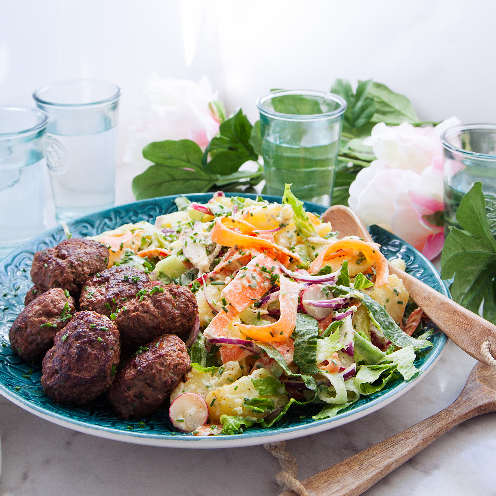 Köttfärsbiffar med gräslöksdressad primörsallad