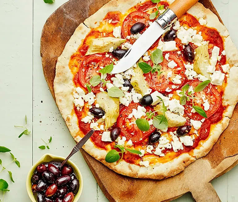 Grekisk pizza med kronärtskocka, fetaost och oregano