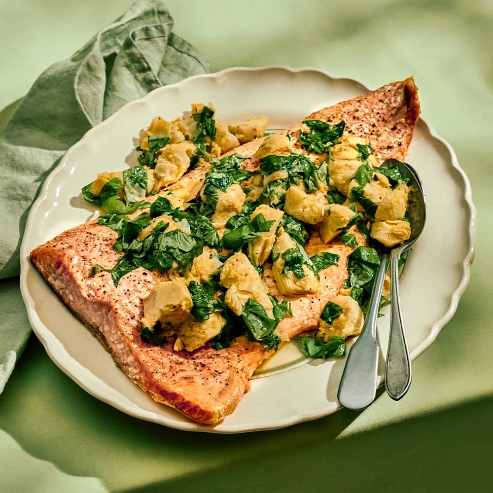 Ugnsbakad laxsida med kronärtskocka, citron och basilika