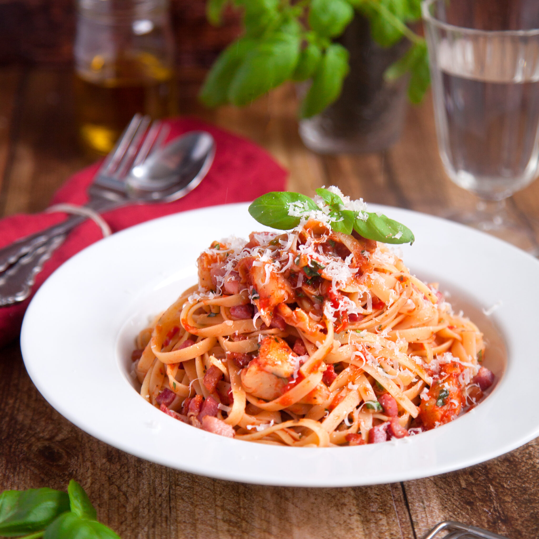Linguini i tomatsås med kronärtskocka och knaprigt bacon