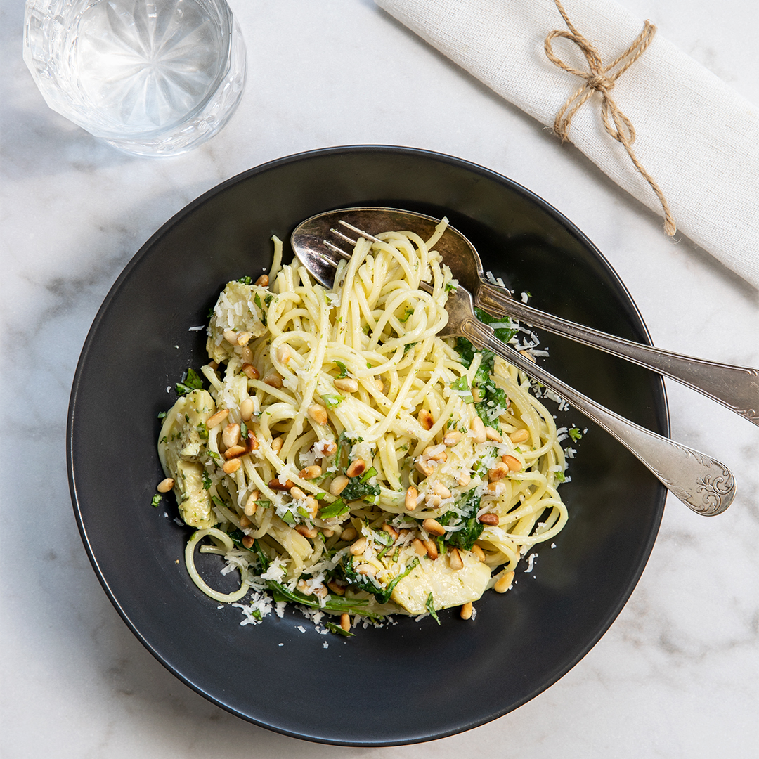 Spaghetti med kronärtskocka och pinjenötter