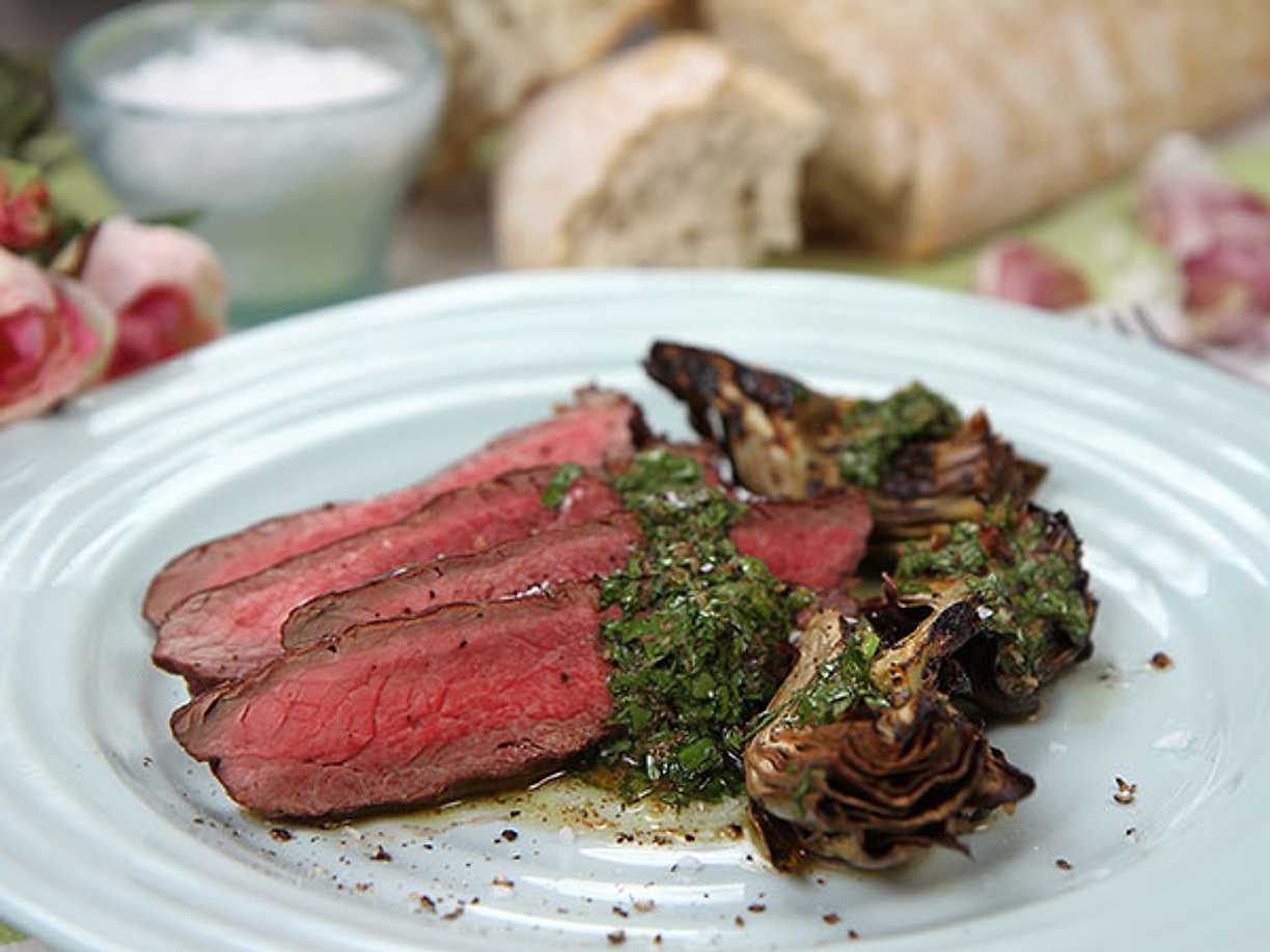 Flankstek med grillade kronärtskockor