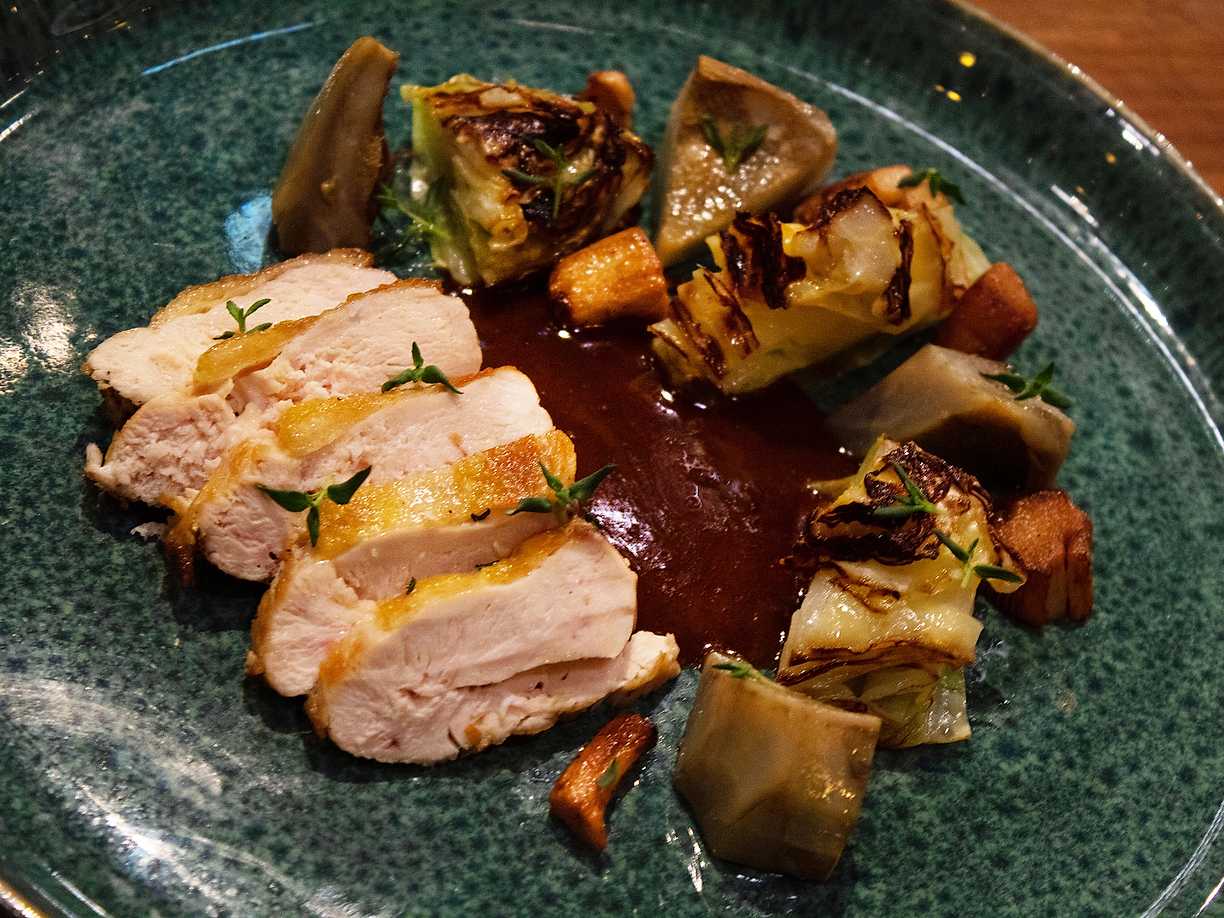 Majskyckling med kronärtskocka, spetskål, kantareller och sås