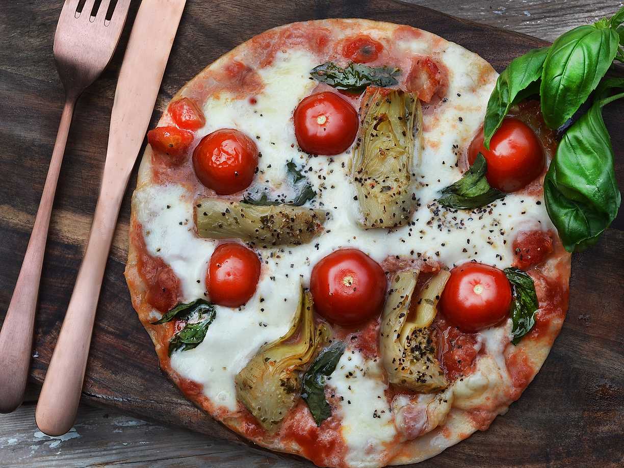 Tortillapizza med mozzarella, basilika och kronärtskocka
