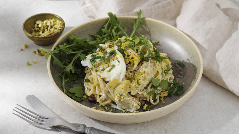 Glutenfri citronpasta med kronärtskocka, mozzarella och pistage