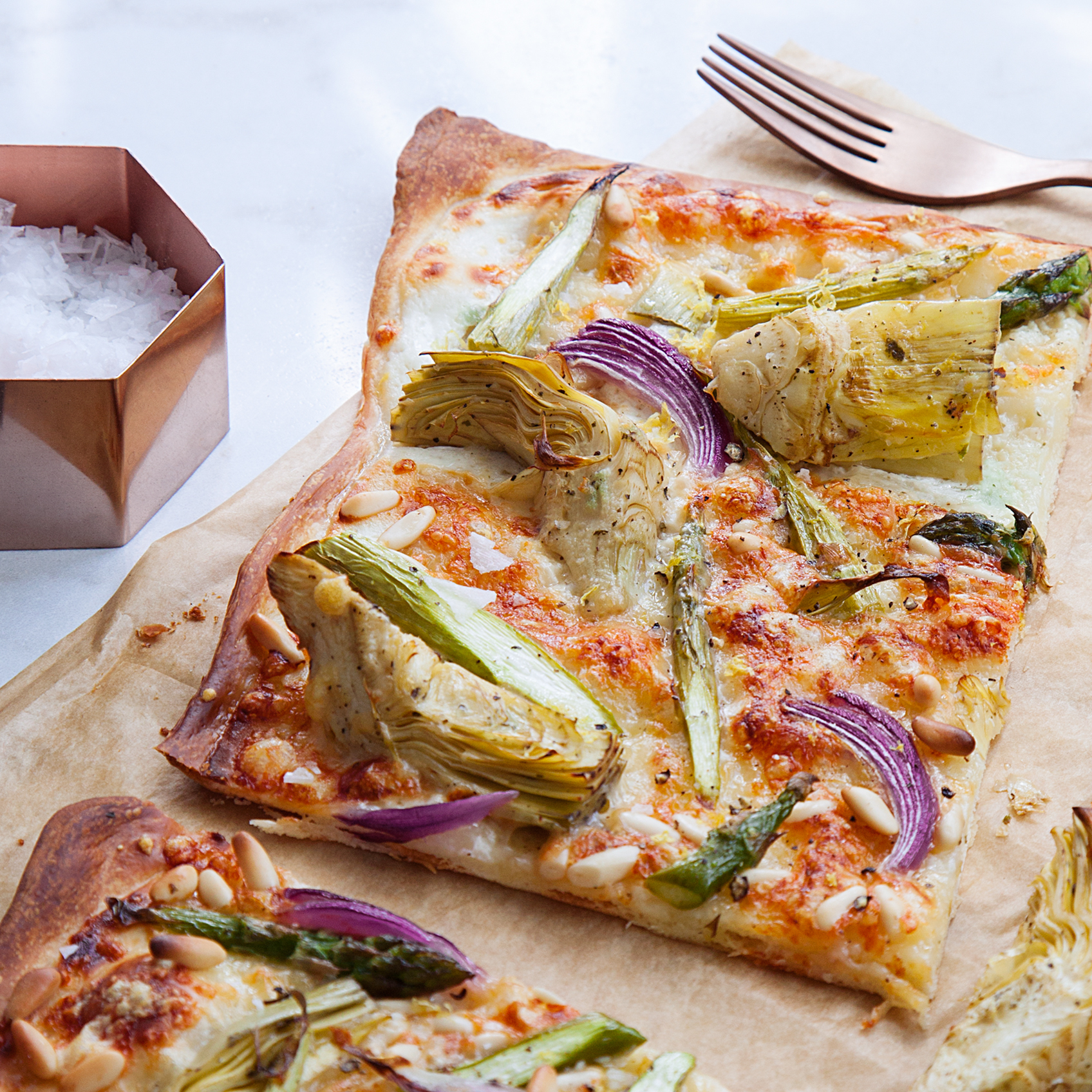 Pizza med kronärtskocka, sparris och mandlar