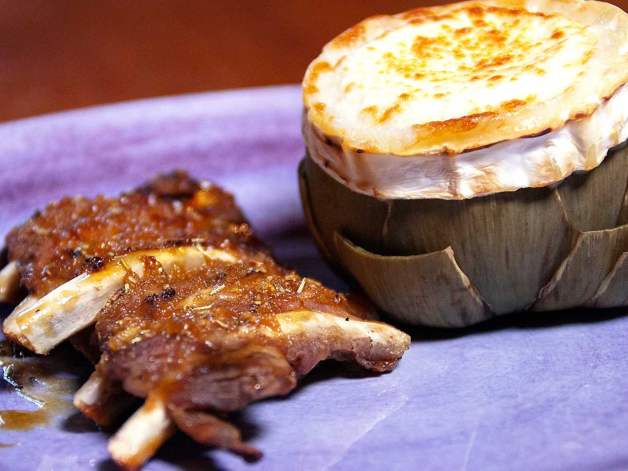 Getostgriljerad kronärtskocka med murkelstuvning och honungsglaserat kamben