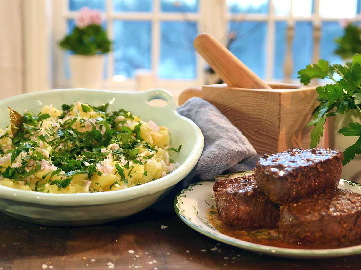 Steak Hasse med krossad potatis och persilja
