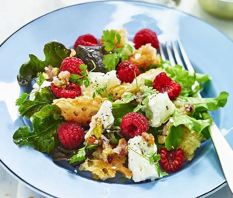 Sallad med getost, hallon, krutonger och pistagevinägrett