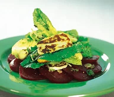 Sallad med stekt halloumi, krutonger och varma rödbetor