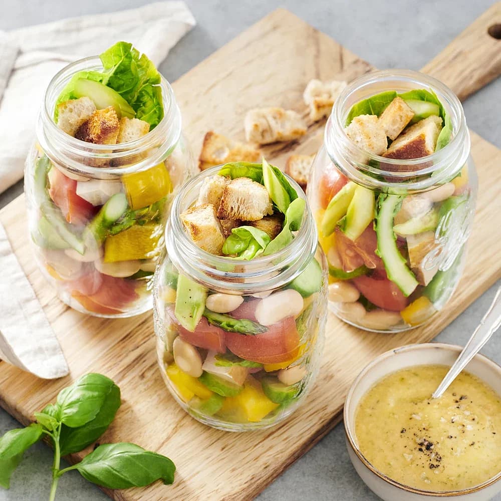 Sallad i burk med mozzarella och krutonger